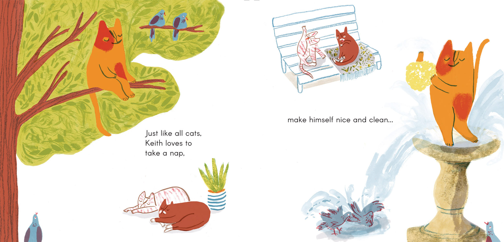 Keith feels different to the other cats, who don't like to wash in bird baths or nap in the branches of trees. He begins to wonder if he actually is a cat. He's always felt more comfortable when surrounded by pigeons, and he envies their way of life. But when he tries to join them, the birds see him as a cat and keep their distance. Is he a cat or a pigeon? Will he manage to find a way to be himself?