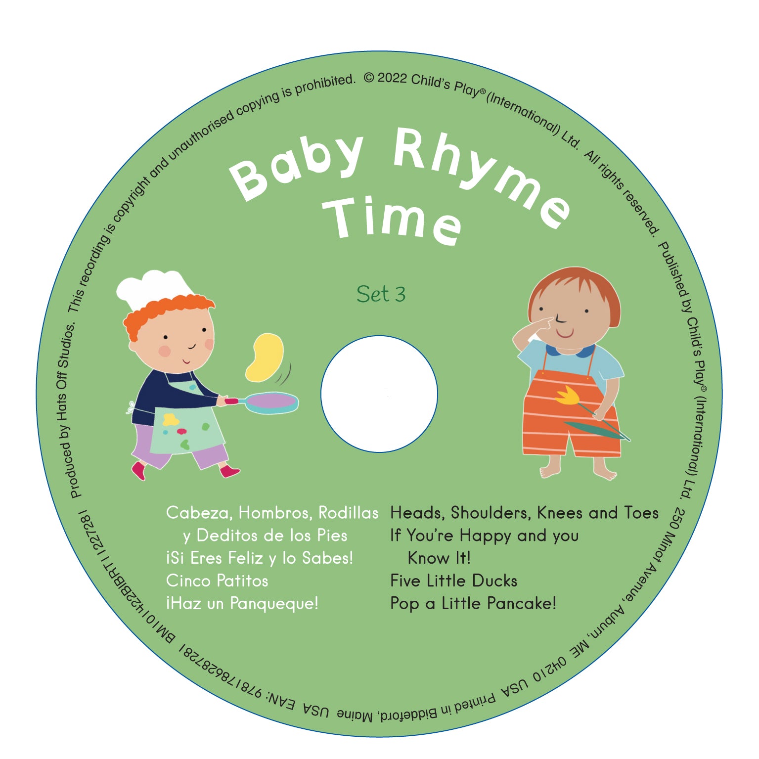 A compilation CD of songs to accompany our bilingual Baby Rhyme Time books. This CD includes: Cabeza, hombros, rodillas y deditos de los pies/Head, Shoulders, Knees and Toes; ¡Si eres feliz y lo sabes!/If You're Happy and You Know It!; Cinco patitos/Five Little Ducks and ¡Haz un panqueque!/Pop a Little Pancake!